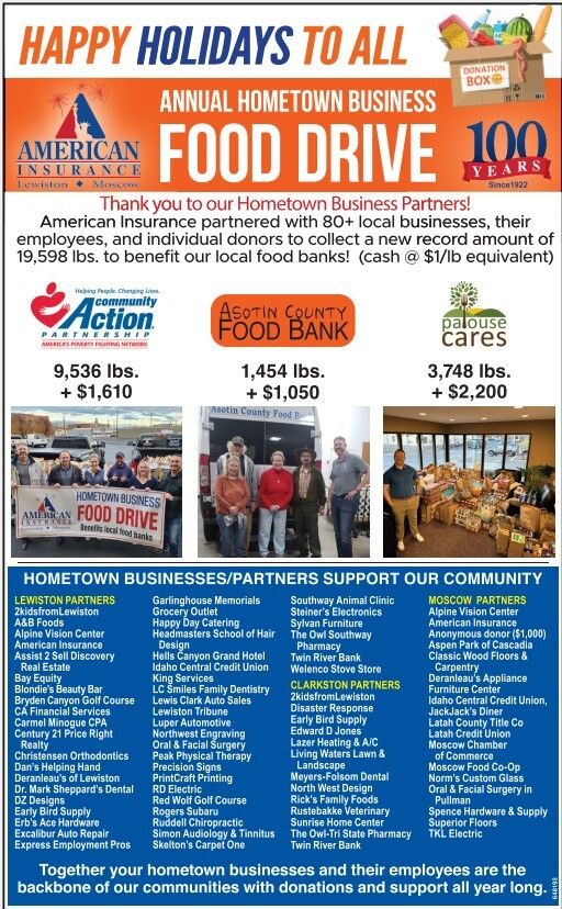 All businesses - small and large, and individuals are invited to partner with us to support our Community Action Food Bank, Asotin Co. Food Bank & Palouse Cares.