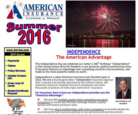 Independence - The American Advantage Roadside Assistance - Help when you need it most! Fireworks Event Schedule - 31 years as major sponsor Insuring trailers - Do I need specific coverage? Refer-a-Friend rewards program Marketplace Double Check - How we find you the lowest insurance rates 2016 SPRING NEWSLETTER - Read about...
